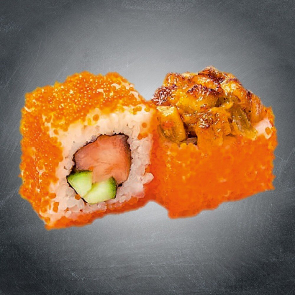 Лосось,огурец,сыр сливочный,тобико,спайси соус,угорь (8шт.)