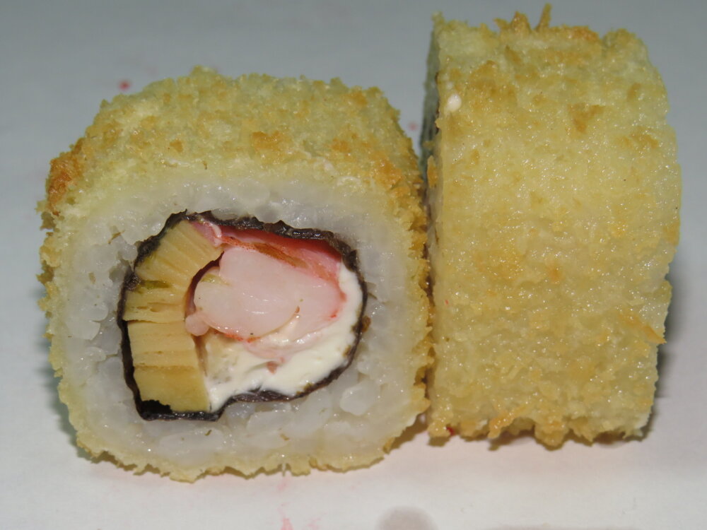 Сыр сливочный, креветка отварная, огурец, кляр, сухари панировочные, рис, нори.(8шт.)