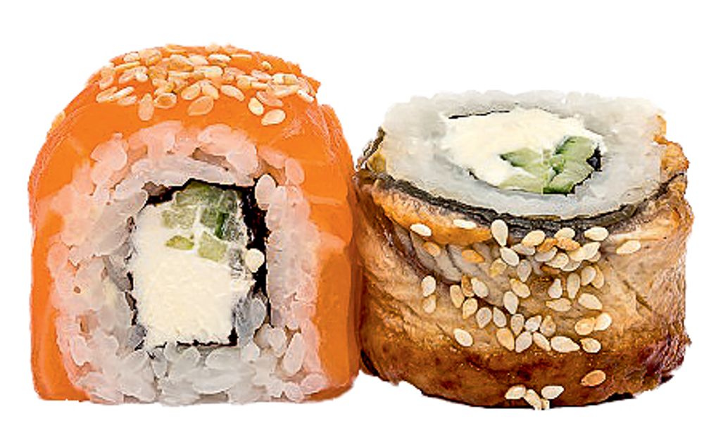 Лосось,угорь копченый,тобико,сыр сливочный,огурец,кунжут,соус унаги,рис.нори,(8шт.)