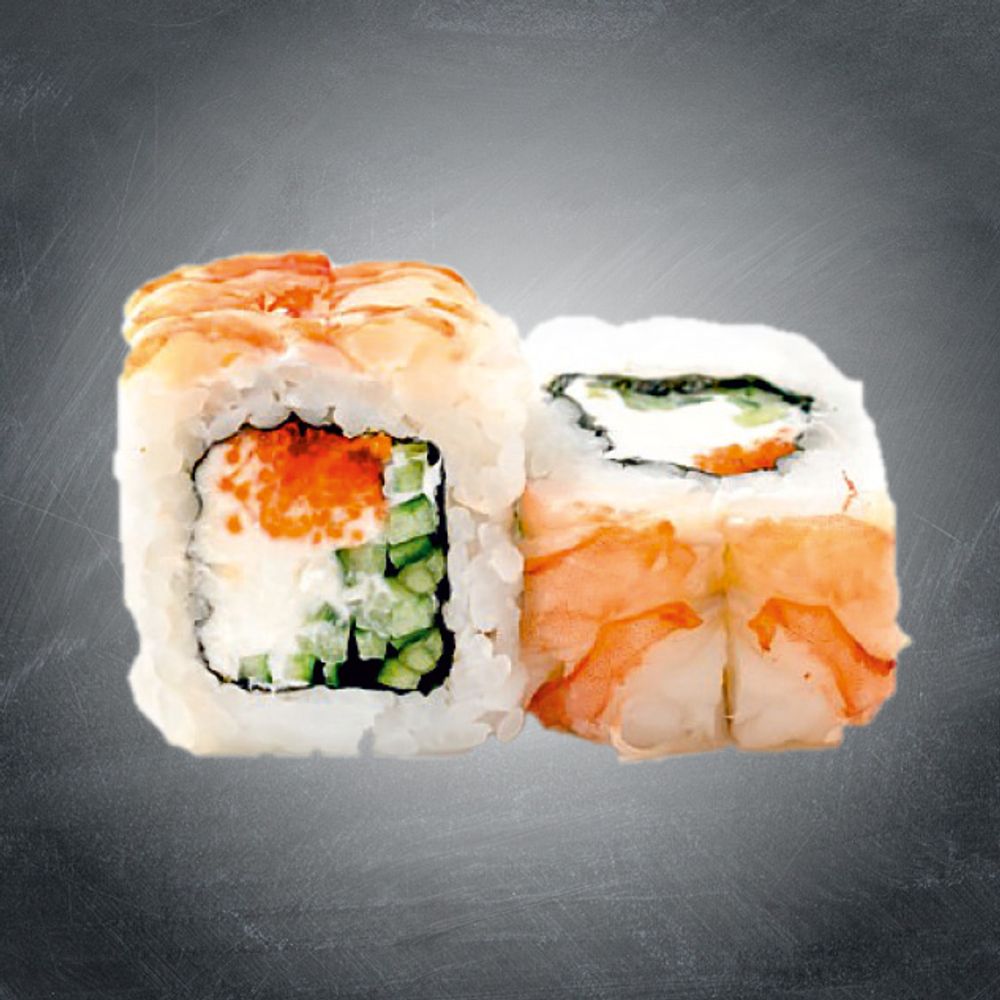 Креветки маринованные,сыр сливочный,тобико,огурец.рис,нори.(8шт.)