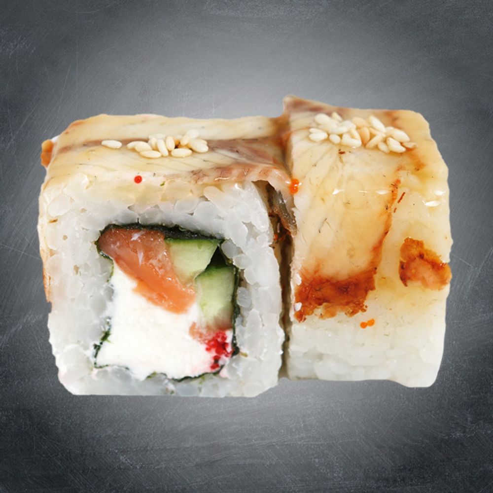Лосось,угорь копченый,спайси соус,сыр сливочный,огурец,унаги соус,кунжут,рис,нори. (8шт.)