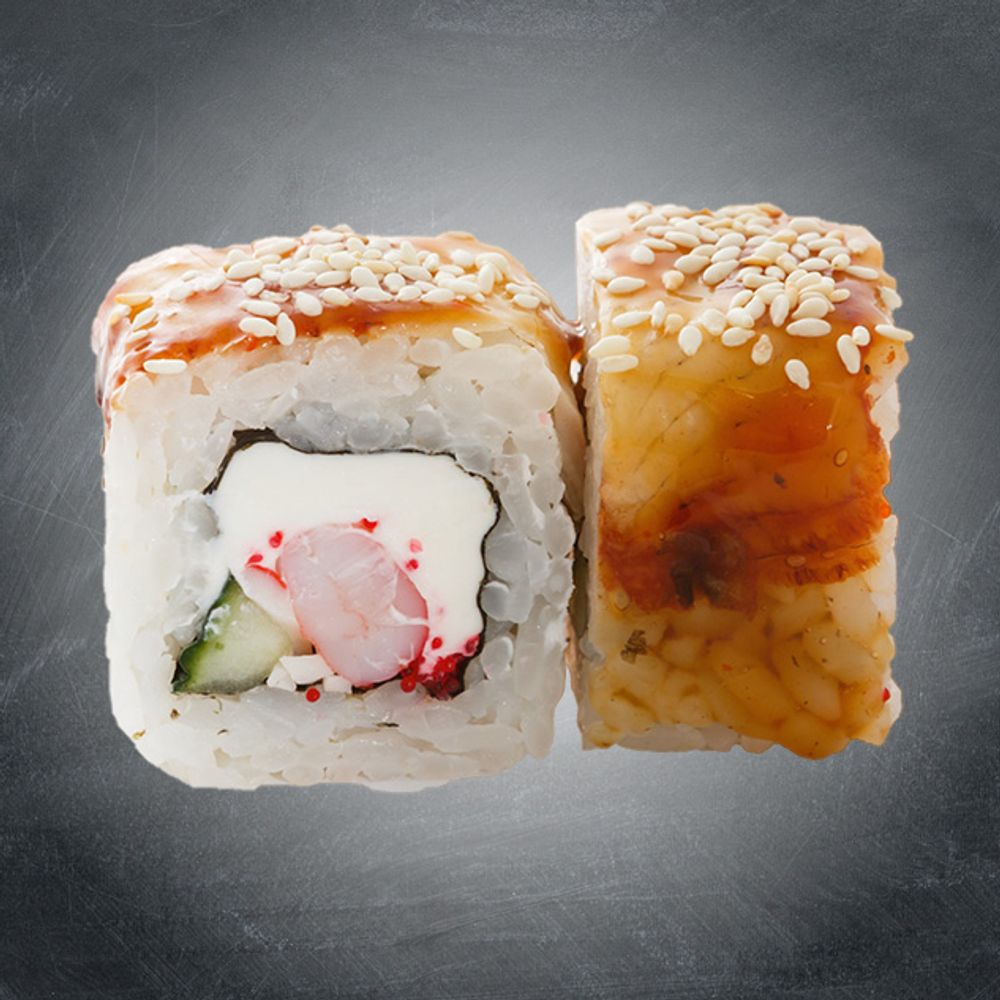 Копченый угорь,креветки маринованные,сливочный сыр,тобико,огурец,кунжут,унаги соус,рис,нори. (8шт.)