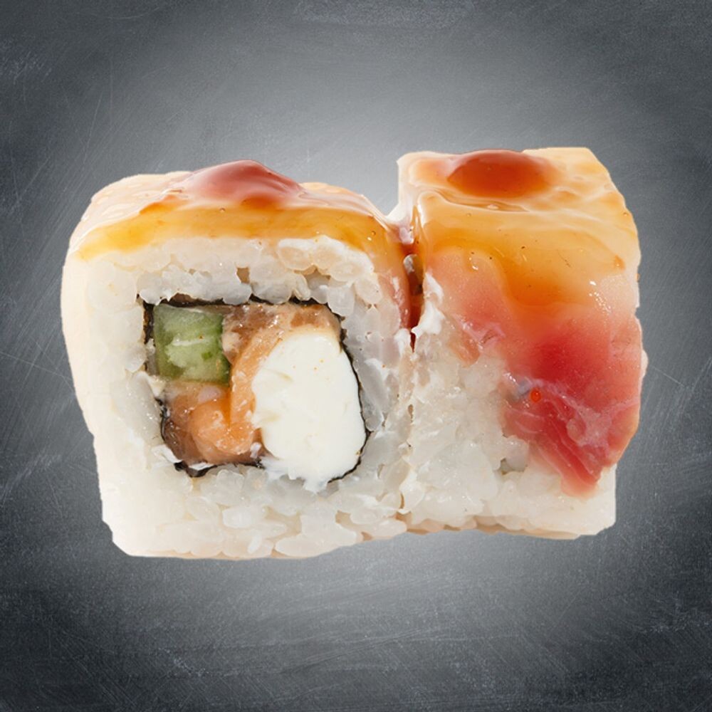 Лосось,окунь,огурец,сливочный сыр,унаги соус,рис,нори. (8шт.)