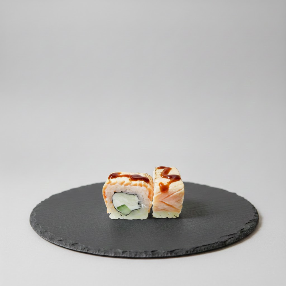 Лосось, опаленный открытым огнем, сливочный сыр, огурец, унаги-соус (8 шт.)