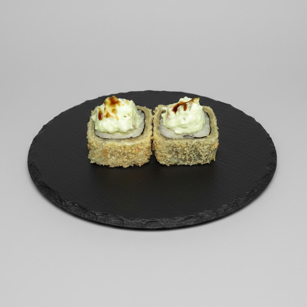 Филе морского окуня, томаго, сливочный сыр, фирменный соус, кляр, сухари панировочные, рис, нори. (8 шт.)
