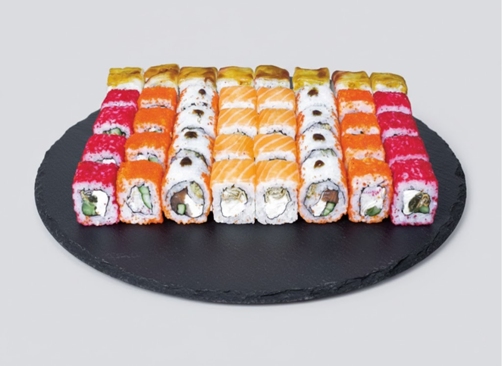 Ролл «Каёси маки», ролл «Фила гурмэ», ролл «Калифорния», ролл «Фиш», ролл «Чиполло» (40 шт.) Соевый соус (4 шт.), имбирь (70 г), васаби (25 г)